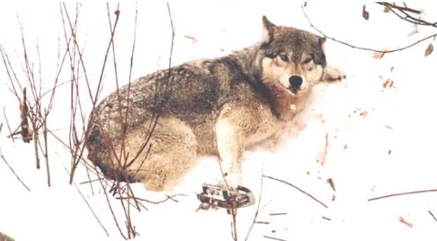 Через время мужчина вышел на лесную поляну, где столкнулся с крупной волчицей. Её лапа были зажата в капкане, и она всячески пыталась освободиться, но устала и легла на землю.