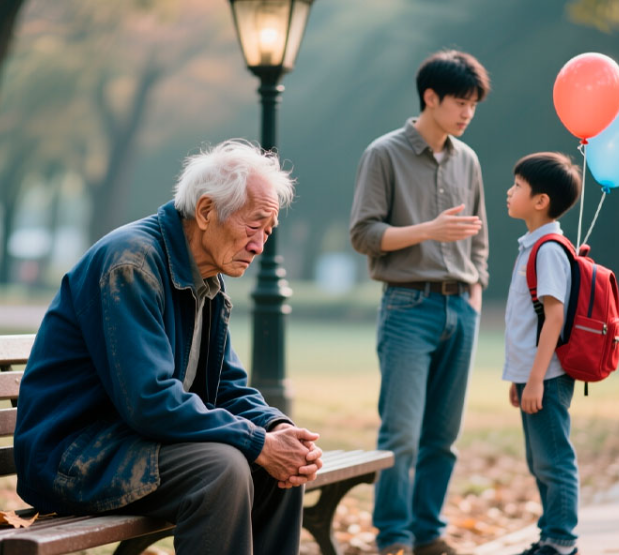 На детской площадке Серёжа вдруг остановился. Он увидел старика на дальней скамейке. Тот сидел, сгорбившись, с пустым взглядом, держа в руках потрёпанный пакет. У его ног лежал мячик.