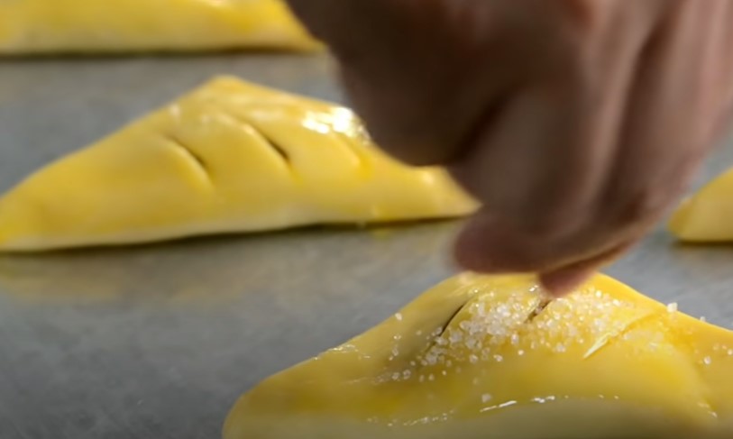 Противень застилаем пергаментом и выкладываем пирожки смазывая их взбитым желтком, посыпаем сахаром.