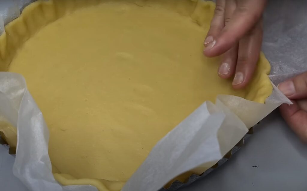 На пергамент выкладываем часть теста, раскатываем круглый пласт больше, чем диаметр формы. Кладем тесто с пергаментом в форму, формируем дно и бортики, удаляем лишнее.