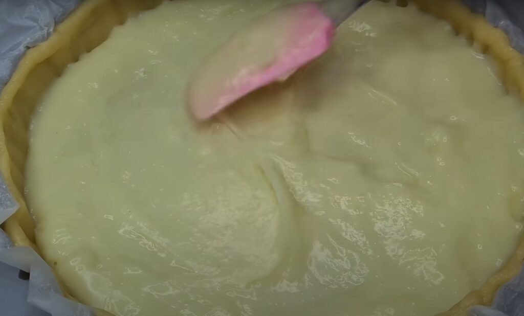 В горячую кремовую основу кладем сливочное масло, вливаем лимонный сок и перемешиваем. Кладем крем в полость теста, которое выложено в форму.