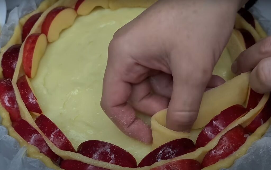 По бортику пирога выкладываем яблочные дольки. По бортику из долек выкладываем пластинки теста.
