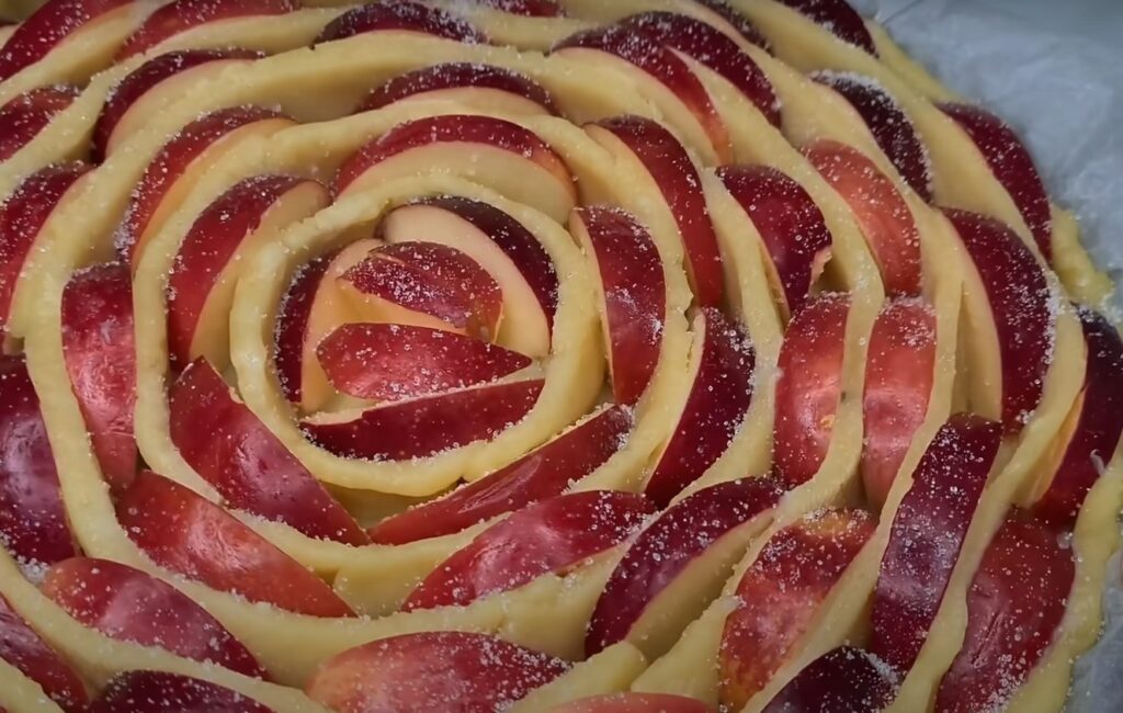 Аналогично выкладываем остальные дольки яблок и пластин теста, пока не покроем подобным узором всю поверхность пирога.